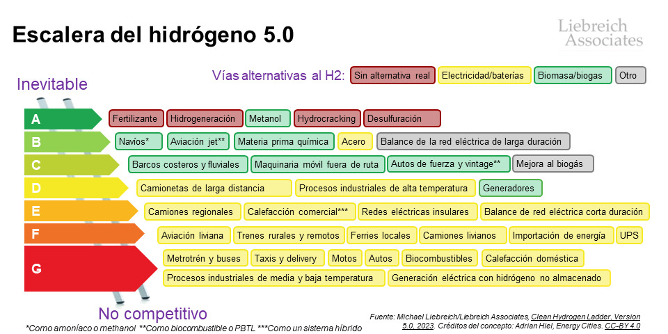 Escalera del hidrógeno, donde “A” es que no hay alternativa al hidrógeno, y “G” es la “fila de la condenación”, haciendo referencia a usos donde nunca será viable. Fuente: Michael Liebreich/Liebreich Associates, Clean Hydrogen Ladder, Version 5.0, 2023. Créditos del concepto: Adrian Hiel, Energy Cities. CC-BY 4.0